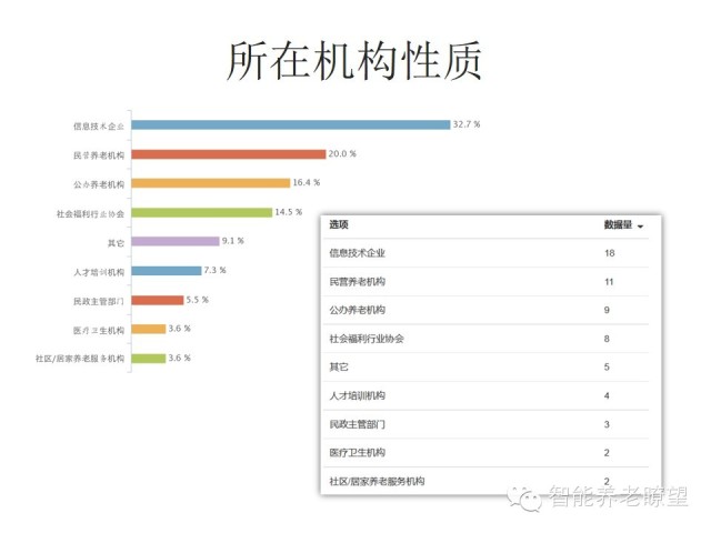 本调查主要通过网络平台如微信、微博以及一些会议的宣传等方式完成,有效参与调查人数为55人,调查对象包括来自北京、天津等15个地区,调查数据保存在金数据中。这次调查中囊括了对企业或机构现有信息系统状况的研究和对信息技术服务及培训的需求等12道题目,从而了解到涉老企业或组织真正的信息化建设需求。