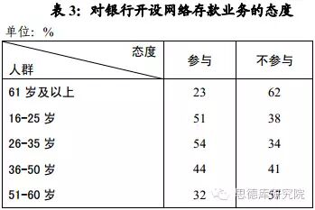 分析发现,与年轻人怕被骗而不参与网络存款有所不同,老年人除了这原因外,还由于不懂上网操作,比例多至71%,与怕钱被盗、被骗的比例持平。由此,即便是由银行推出的网络存款业务,超过六成老年人表示不参与,参与者为23%(见表3),不足年轻人的一半。
