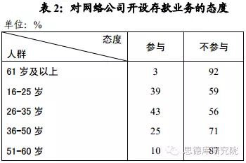 与上述两种上网行为不同,前两年颇为流行的余额宝等网络公司开设存款业务,大多数老年人拒绝,多达92%的人表示不参与,参与的仅有3%(见表2)。