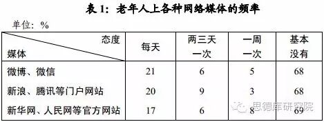 在各种网络媒体中,微博微信和新浪腾讯等门户网站更受老年人青睐,每周浏览一次以上的人均为32%,其中每天一次的就有21%与20%;其后是新华网、人民网等官方网站,每天都上的为17%(见表1)。