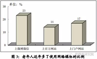 调查也发现,与单向发布资讯的网站相比,互动性、娱乐性更强的微博微信,近两年越来越受老年人欢迎,表示自己多了上微博微信的人有23%,较多了上网站的比例明显高6至9个百分点(见图3)。