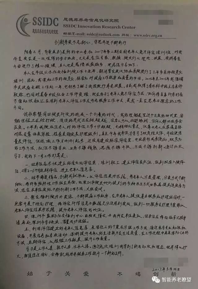 我非常赞同田院长所说的,这是一个创变的时代,我的理解是在这个巨变的时代里,固有的经验正在被打破,传统的范式正在被超越,没有人可以回避挑战,任何人都必须学会改变。十年前我院收住老人时的评估工作十分粗糙,无精细化量表,仅靠与老人及家属直接对话及靠临床体检、检查来确定其护理级别。直至今年我单位才学习了规范性文件,开始使用量表评估,但这项工作才刚刚起步,还没有建设标准评估室,也没有形成系统化、规范化的工作方式,队伍不够专业,业务不够精熟,思想不够开放,方法不够创新。通过此次学习,我的下一步工作打算是: